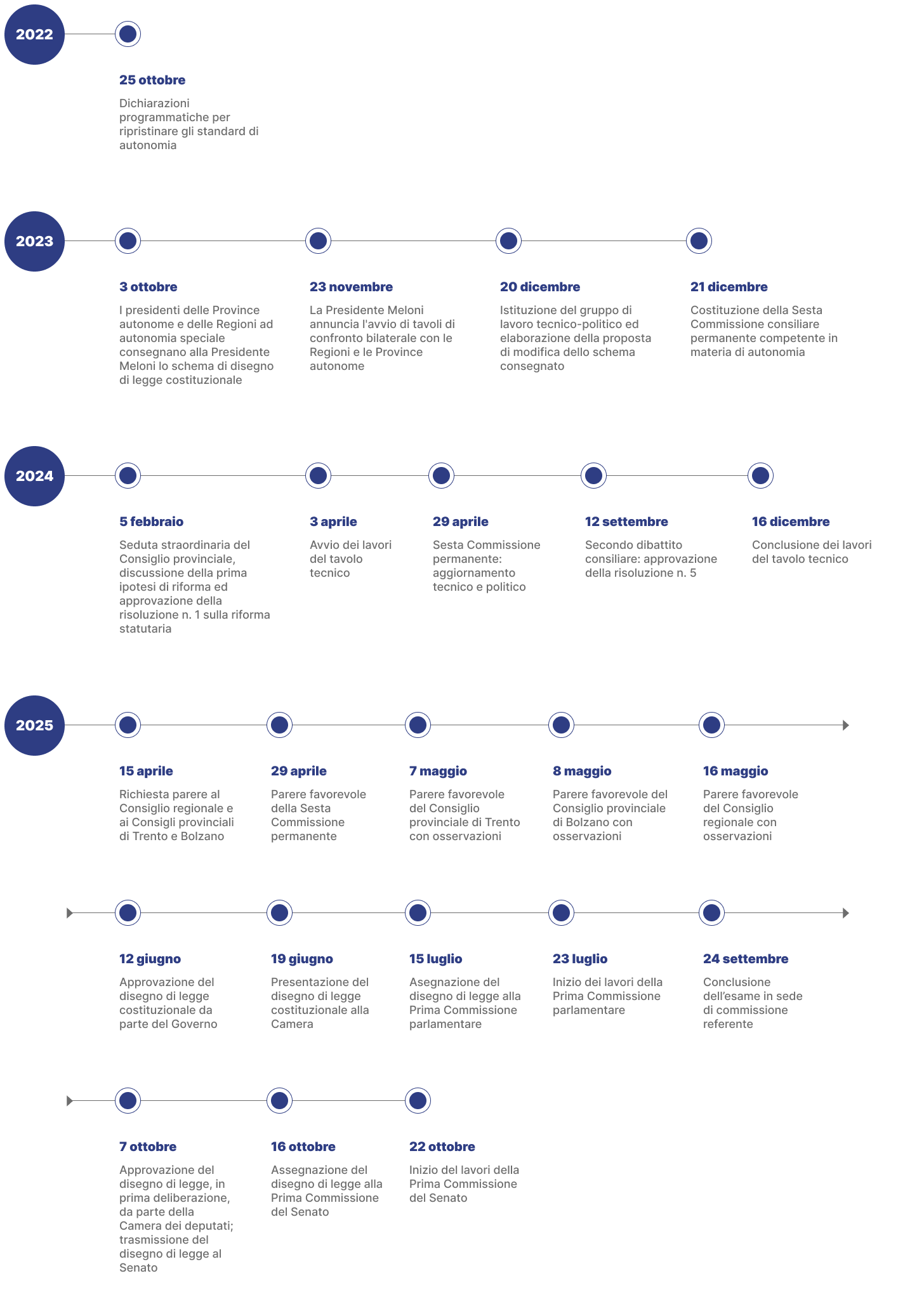 ​Da questi primi passi si sviluppa un articolato confronto, tecnico e politico, fra il Governo e i Governatori delle autonomie speciali per l'elaborazione di una proposta di riforma statutaria d'iniziativa governativa ma condivisa con i territori autonomi; nel contempo si sviluppa un altrettanto articolato dibattito a livello provinciale, fra Giunta e Consiglio provinciale, in merito ai contenuti della riforma.​